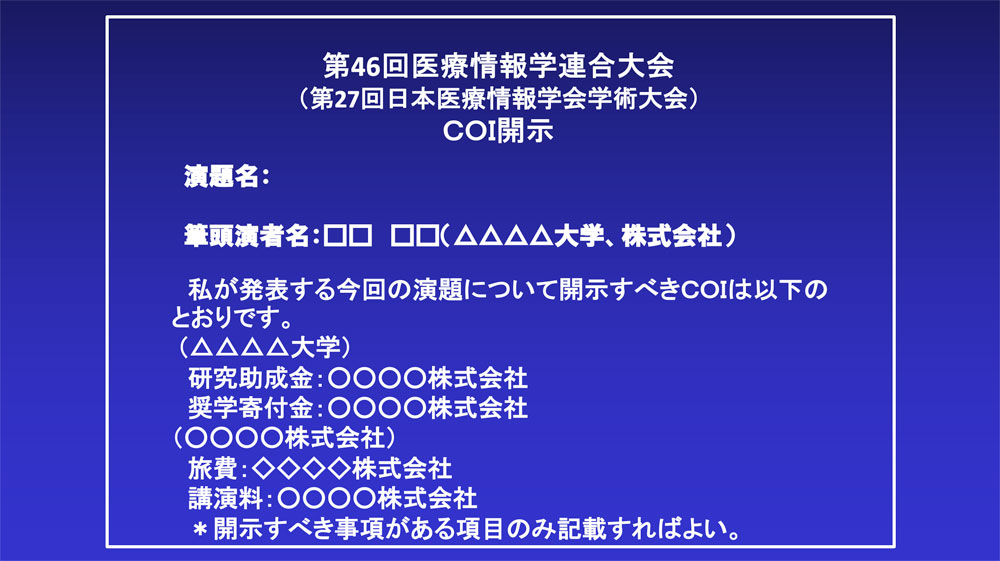 すべての発表者は、自分が発表する内容に関する利益相反状態を開示してください。口頭発表の場合はスライド等で、ポスター発表の場合はポスター等で開示してください(例1)。