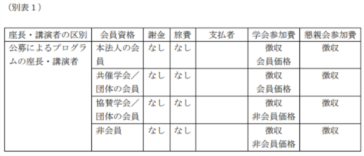 4)公募によって採択されたプログラムの講演者・座長は、原則として、要請者とはみなさない。すなわち、本法人の会員または共催学会/団体の会員、協賛学会/団体の会員以外の者であっても、公募プログラムの講演者・座長には、謝金、旅費を支払わない。また、大会参加費、懇親会参加費は免除しない。