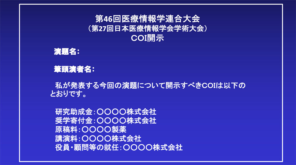 すべての発表者は、自分が発表する内容に関する利益相反状態を開示してください。口頭発表の場合はスライド等で、ポスター発表の場合はポスター等で開示してください(例1)。